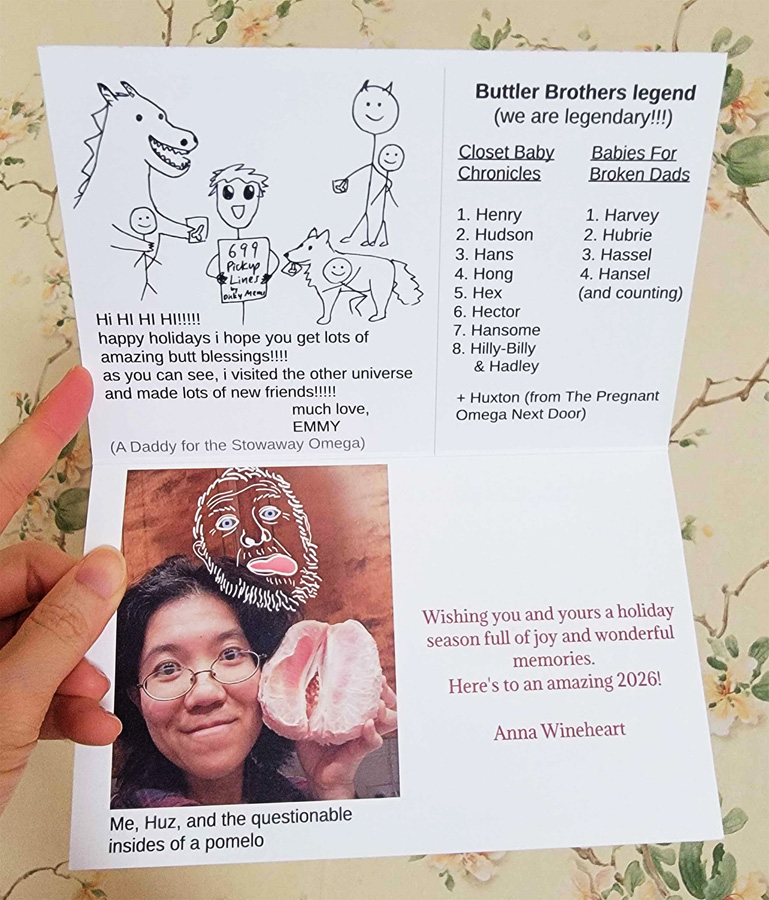Anna Wineheart’s 2025 holiday card, featuring the Buttler Brothers (from Closet Baby Chronicles and Babies For Broken Dads).